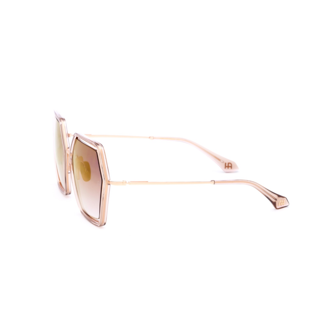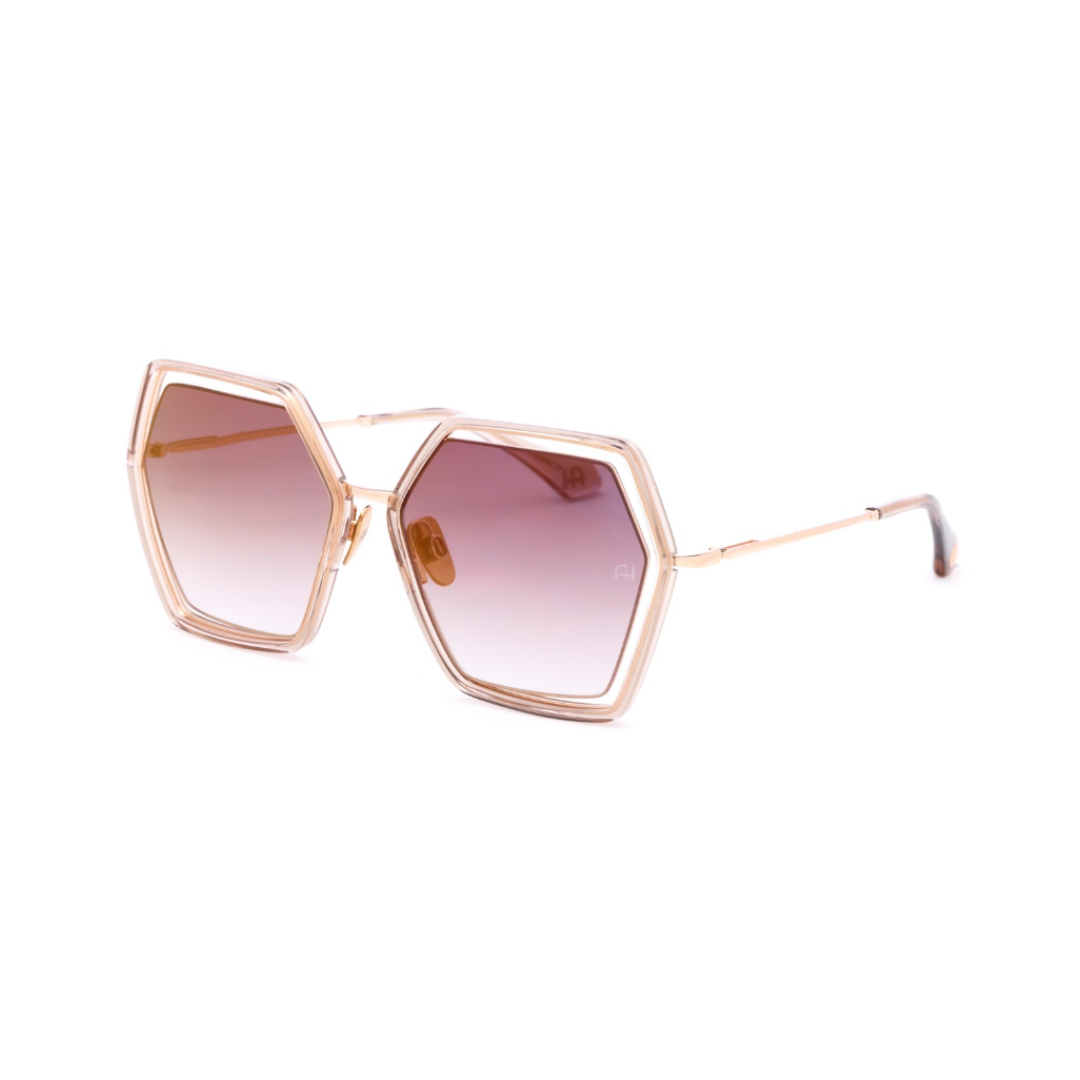 Óculos de sol grandes e ousados com um design frontal hexagonal marcante. A parte externa da frente é feita de acetato grosso, enquanto as lentes são ligeiramente afastadas da armação, criando uma interação dinâmica de formas e espaços. As hastes finas de metal fornecem um contraste elegante, equilibrando a estética ousada da frente com um toque de elegância.