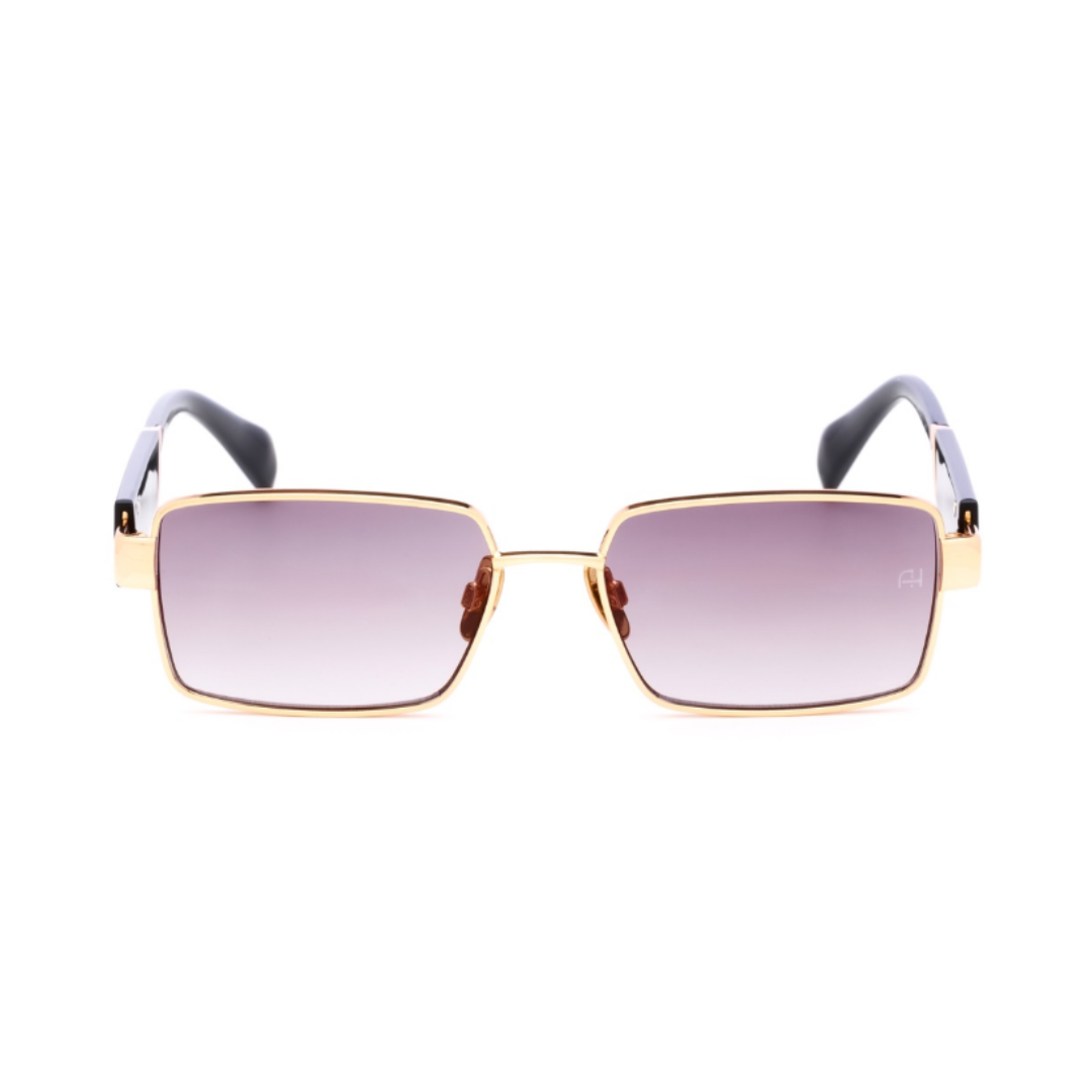 Óculos de sol com frente retangular de metal, oferecendo uma estética elegante e minimalista. As hastes de acetato ousadas criam um contraste impressionante, adicionando um toque de modernidade e caráter ao design.