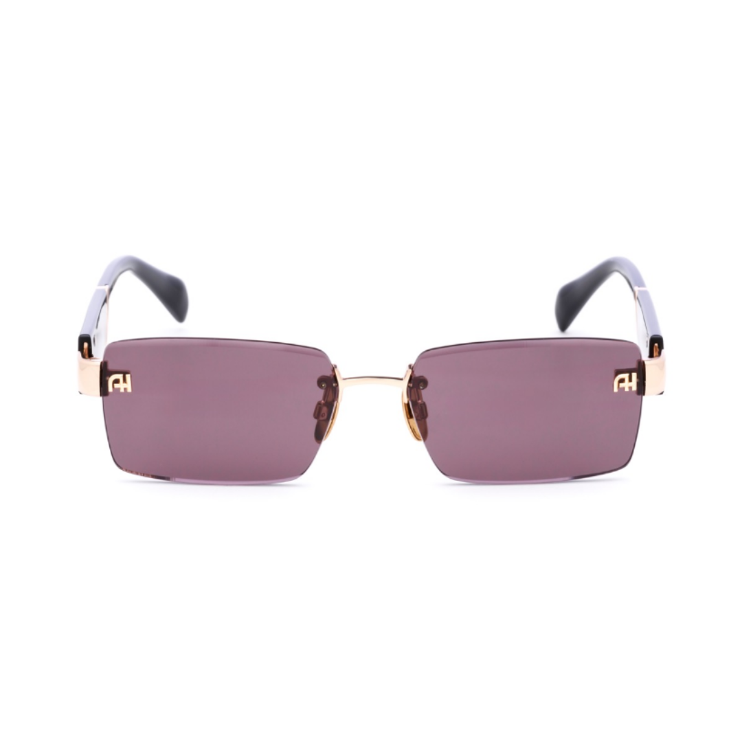 Óculos de sol sem aro com uma frente retangular elegante combinada com uma ponte de metal refinada para uma estética minimalista e moderna. As hastes de acetato ousadas criam um contraste intrigante, adicionando profundidade e caráter ao design.