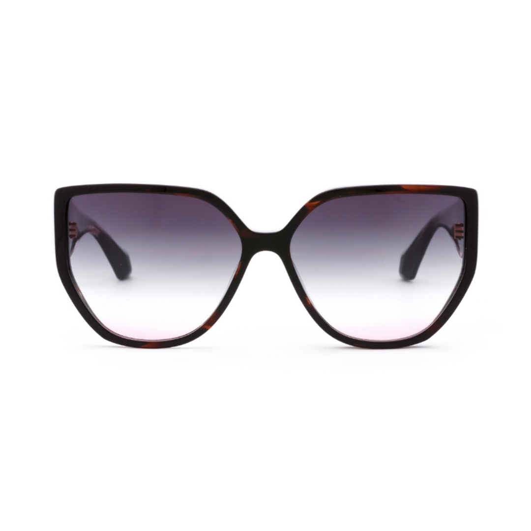 Óculos de sol em acetato ousados com linhas esculpidas que criam um jogo intrigante de formas 3D. O acetato semitransparente nas hastes revela vislumbres da estrutura subjacente, criando uma intrigante interação de materiais e cores