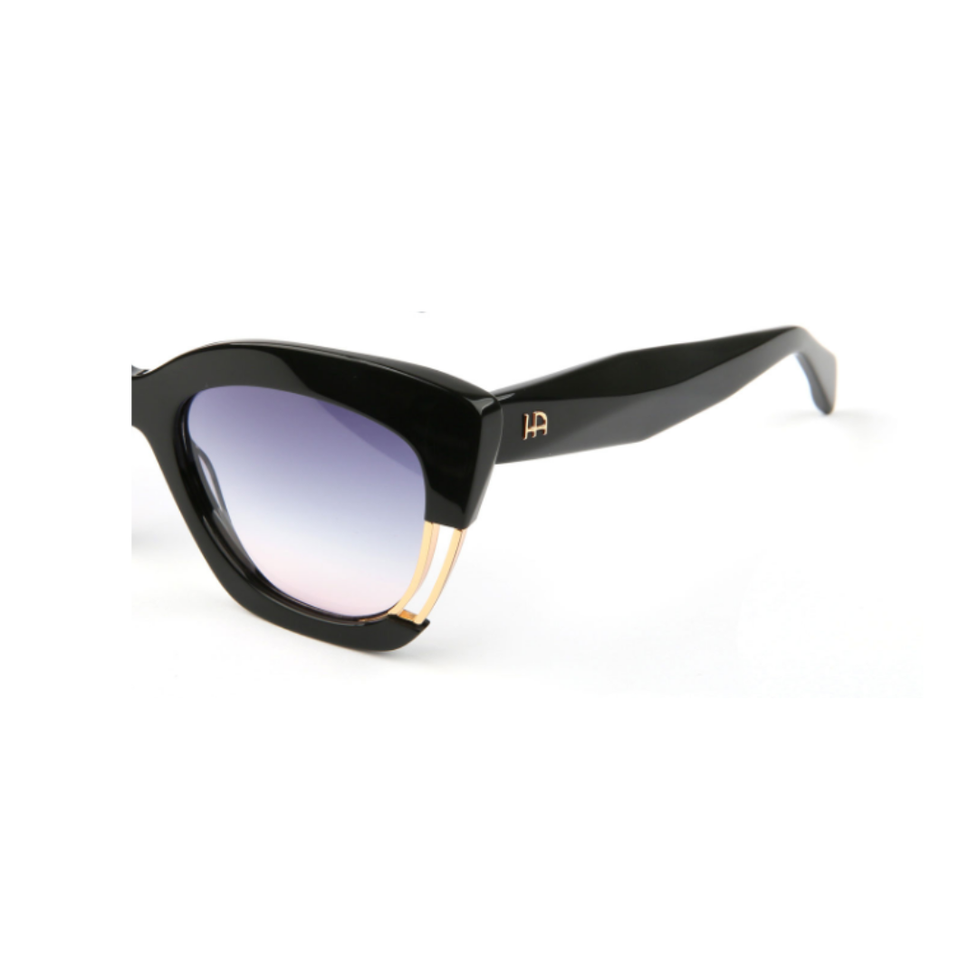 Óculos de sol feitos de acetato premium, com um formato moderno de olho de gato que exala elegância contemporânea. As bordas externas da frente são adornadas com um detalhe dourado, adicionando um toque luxuoso e sofisticado ao design.